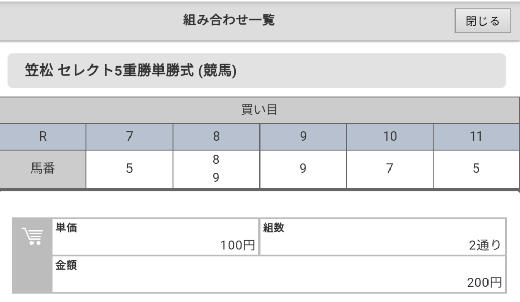 買い目:[5]-[8,9]-[9]-[7]-[5]